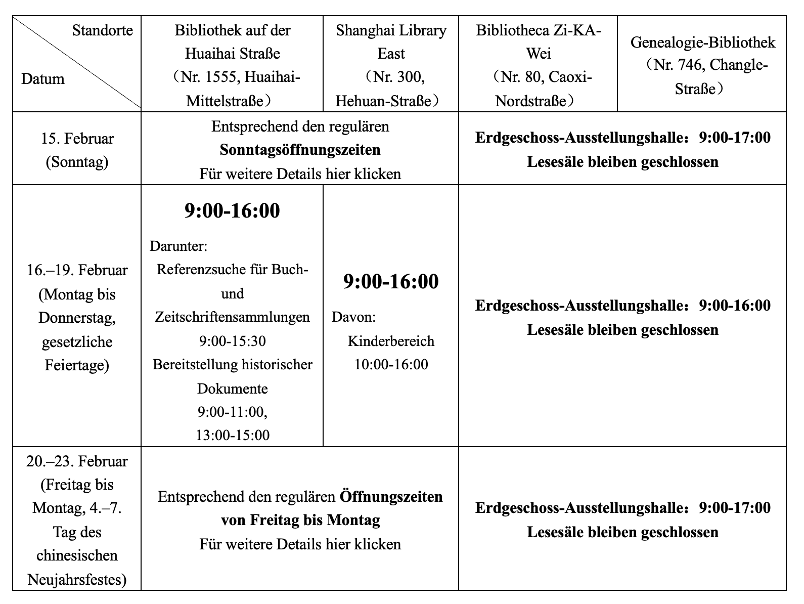 Während des Frühlingsfests 2026 sind die Öffnungszeiten der Shanghai Library (Shanghai Institute of Science and Technology Information) wie folgt: