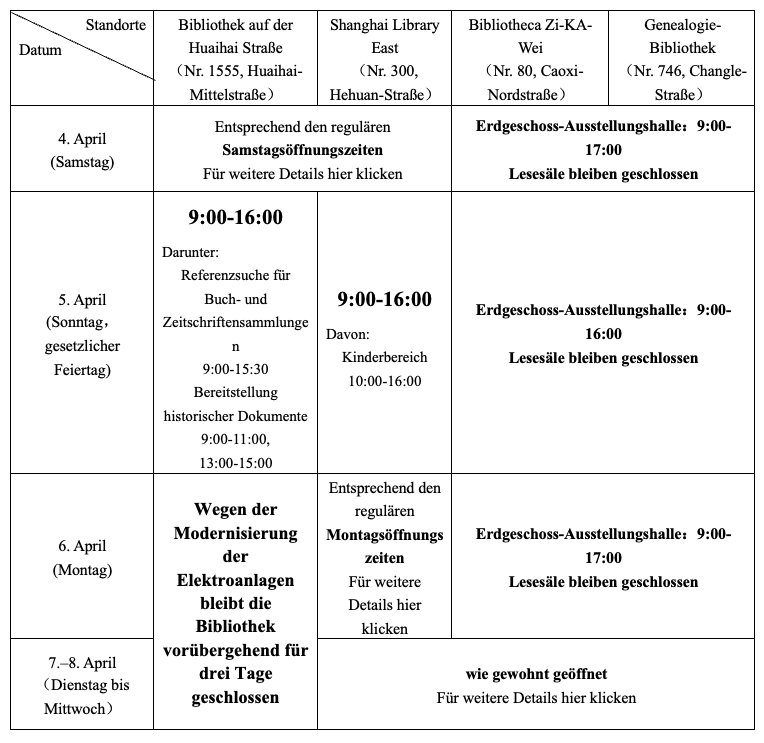 Während des Qingming-Festes 2026 sowie an den beiden darauffolgenden Tagen gelten für die Shanghai Library (Institute of Scientific and Technical Information of Shanghai) folgende Öffnungszeiten: