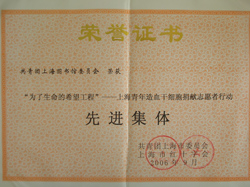 上海青年造血干细胞捐献志愿者行动先进集体荣誉证书